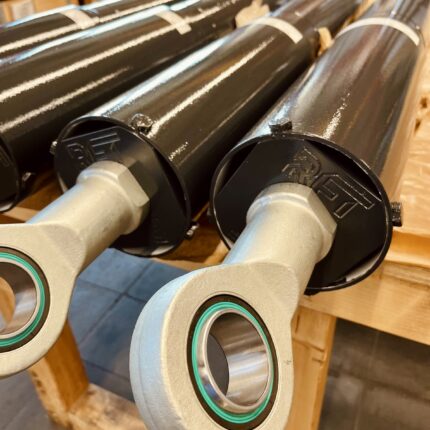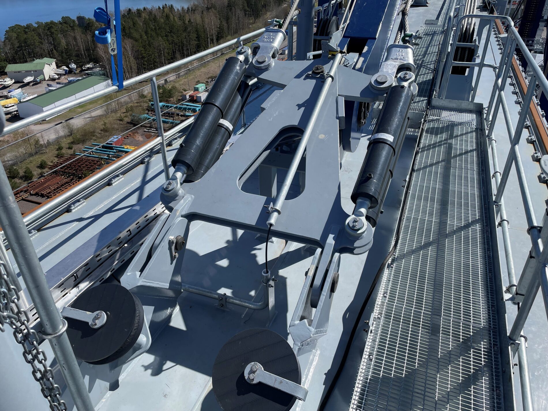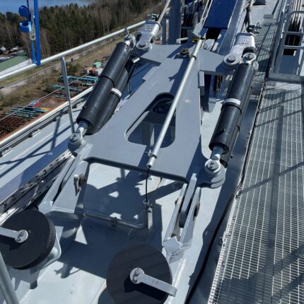 Rope rocker dampers will be mounted parallel to both ropes. These dampers are linked with the rope sweep and the supporting structure by joints. In case of a rope failure the rope rocker dampers damp immediately so that a free-fall way of the load can be avoided.